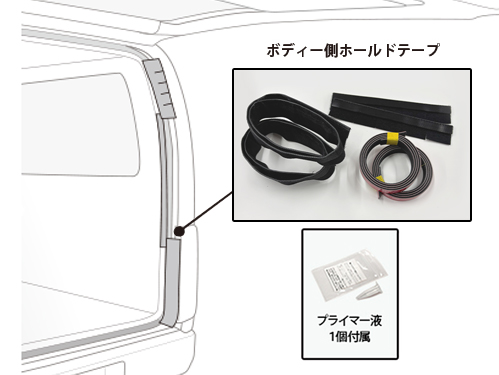 バックドア側ホールドテープに使用する粘着剤の補助剤(プライマー液)を同梱しておりますが、 大変揮発性が高く日数が経過すると半減する場合があります。