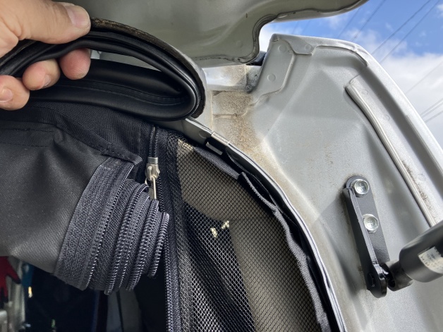 (参考)ボディ側のテープの長さは120.5センチで、上端の開始位置を説明書どおりサイドカバーから7センチ(画像3)にすると、長さが最後になって3センチほど足りなくなります(画像4)。問い合わせたところ、長さはデフォルトで、下端も余るはずとのことでした。