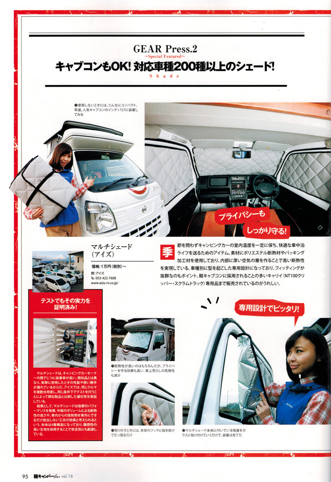 季節を問わずキャンピングカーの室内温度を一定に保ち、快適な車中泊ライフを送るためのアイテム。素材にポリエステル断熱材やパッキング加工材を使用しており、内部に厚い空気の層を作ることで高い断熱性を実現している。車種別に方を起こした専用設計になっており、フィッティングが抜群なのもポイント。軽キャブコンに採用されることの多いキャリイ(NT100クリッパー・スクラムトラック)専用品まで販売されているのがうれしい。
