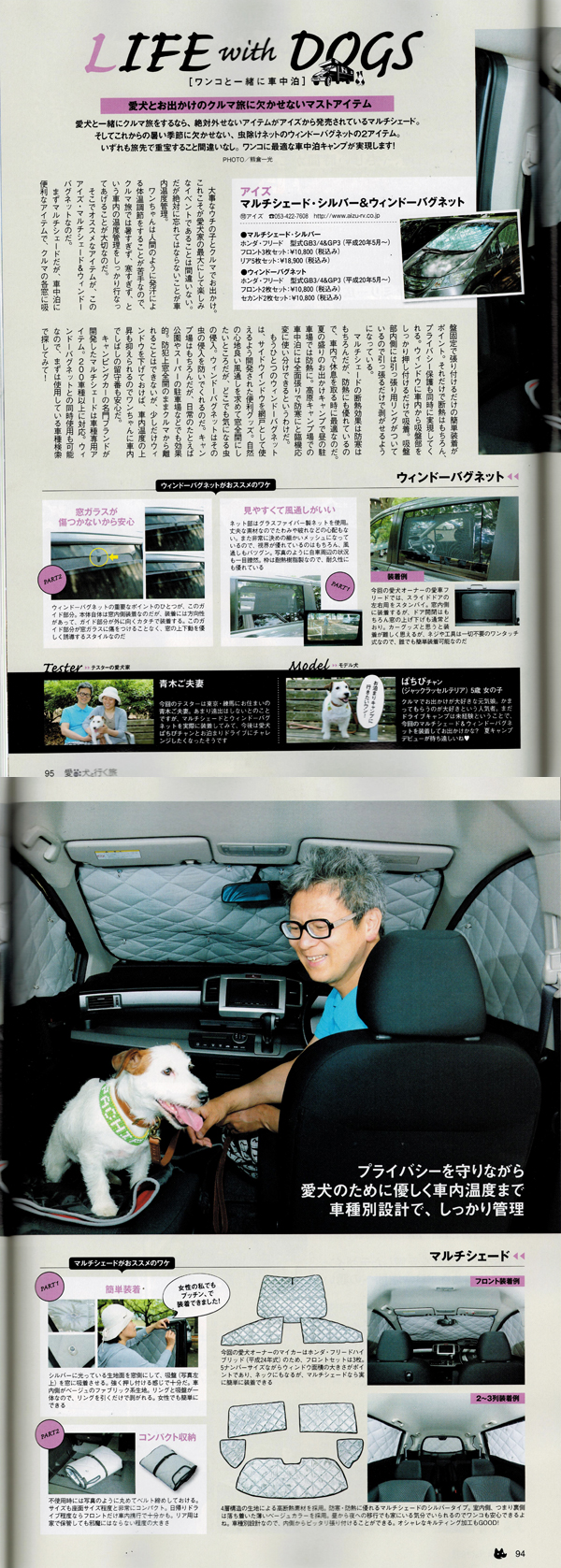 ワンちゃんは人間のように発汗による体温調節が苦手なので、クルマ旅では暑すぎず、寒すぎず、という車内の温度管理をしっかり行ってあげることが大切なのだ。そこでオススメなのがアイズ・マルチシェード&ウィンドーバグネットなのだ。マルチシェードの断熱効果は防寒はもちろんだが、防熱にも優れているので休息をとる時に最適なのだ。夏の森のお出かけキャンプで昼の駐車場では防熱に。高原キャンプ場ので車中泊には全面張りでの防寒にと臨機応変に使い分けできるというわけだ。もうひとつのウィンドーバグネットは網戸として使えるよう開発された便利グッズ。自然の心地よい風通しを求めて窓全開にしたいところだが、どこでも気になる虫の侵入。ウィンドーバグネットはその虫の侵入を防いでくれるのだ。キャンプ場はもちろんだが日常のたとえば公園やスーパーの駐車場などでも効果的。防犯上窓全開のままクルマから離れることは出来ないが、少しだけウィンドウを下げておけば、車内温度の上昇も抑えられるのでワンちゃんの車内でしばしの留守番も安心だ。